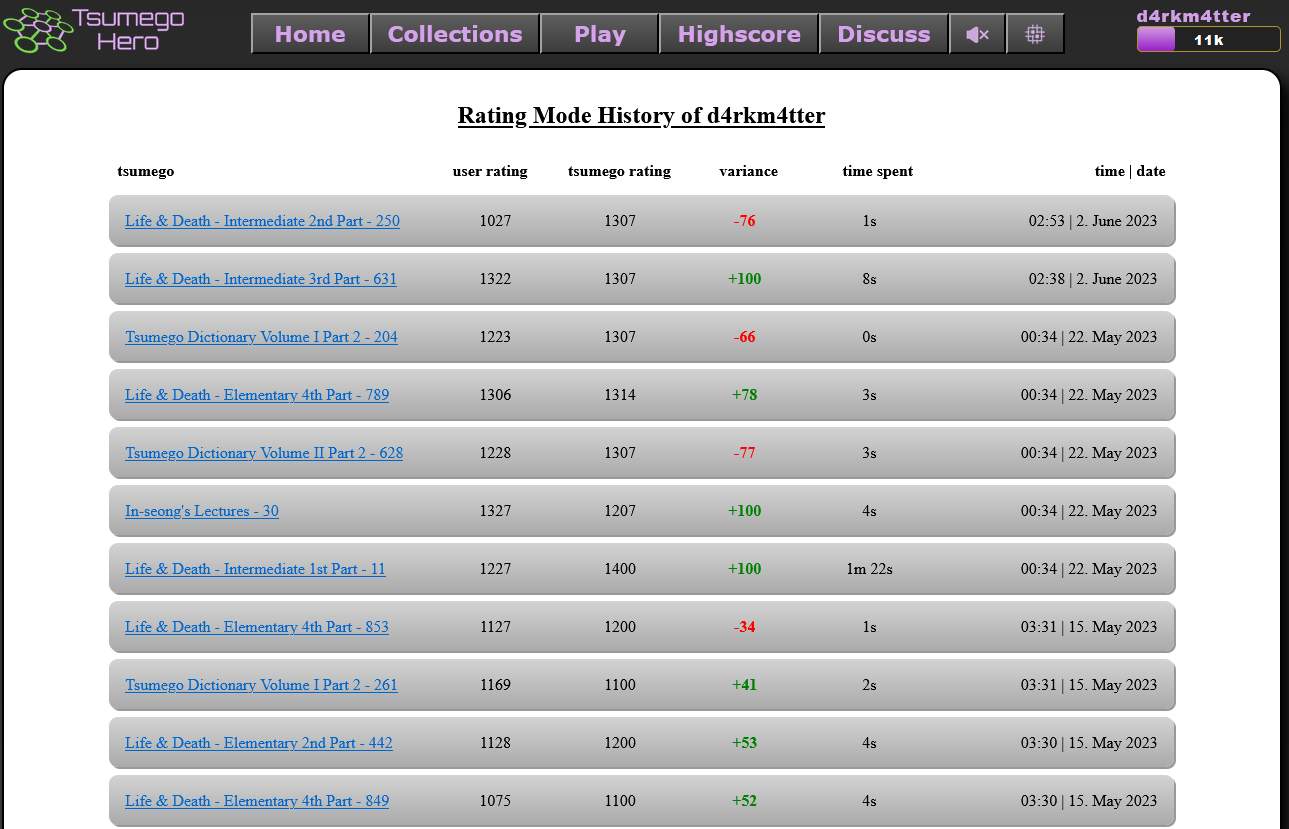 The rating mode history page shows your most recent attempts in the rating mode. You can see how much rating you gained or lost and you can go to the problem to try it again.